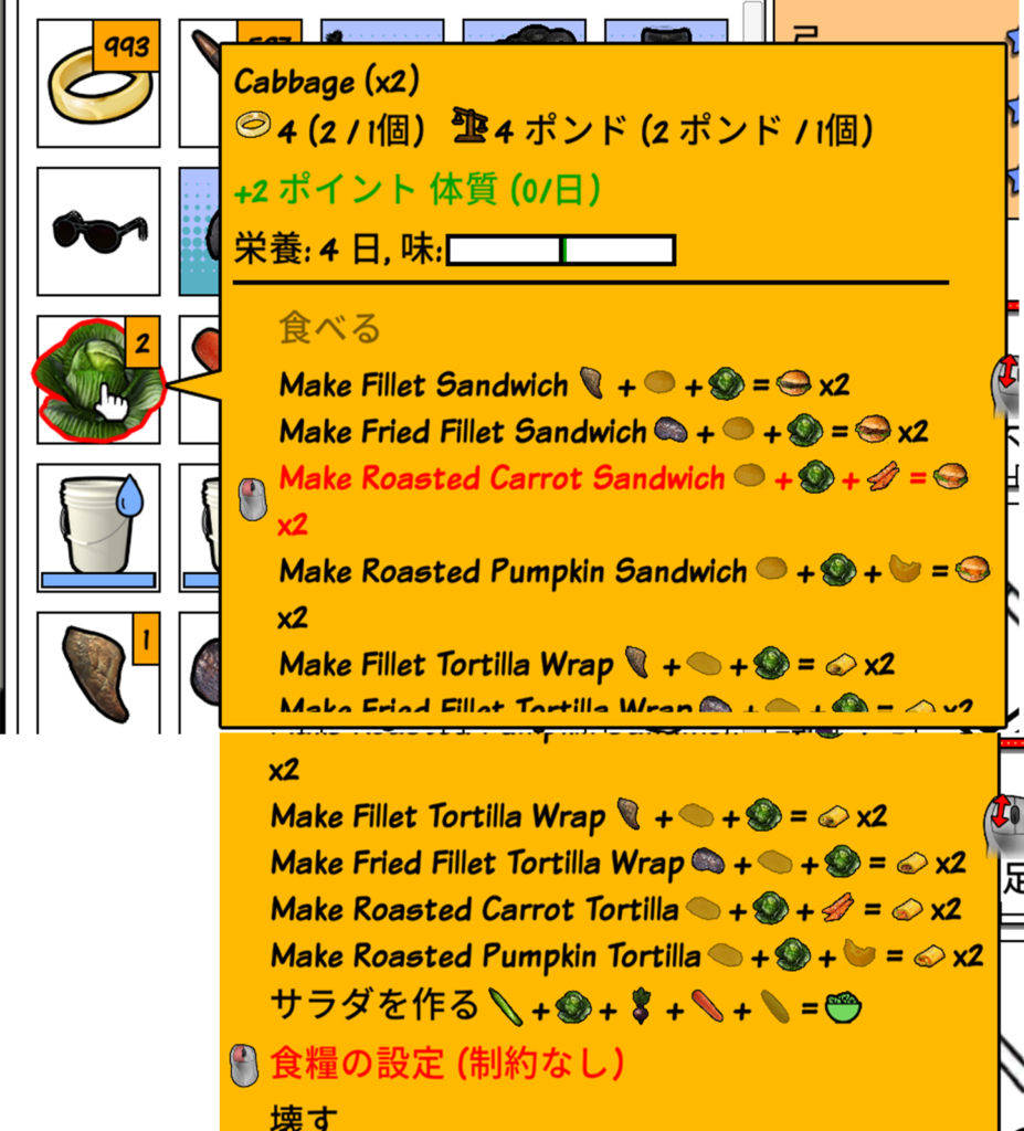 - Make Fillet Sandwich:フィレサンドイッチ ⇒ 調理方法:調理されたうさぎ肉+コーンミールパン+きゃべつ