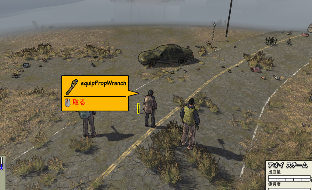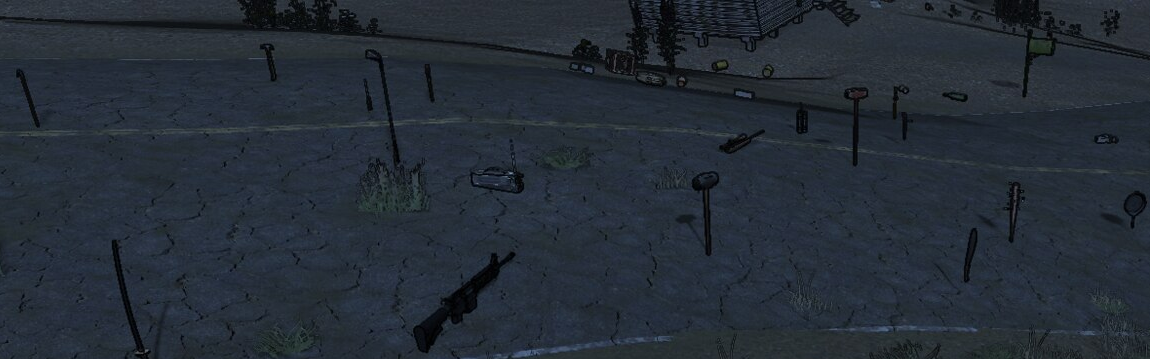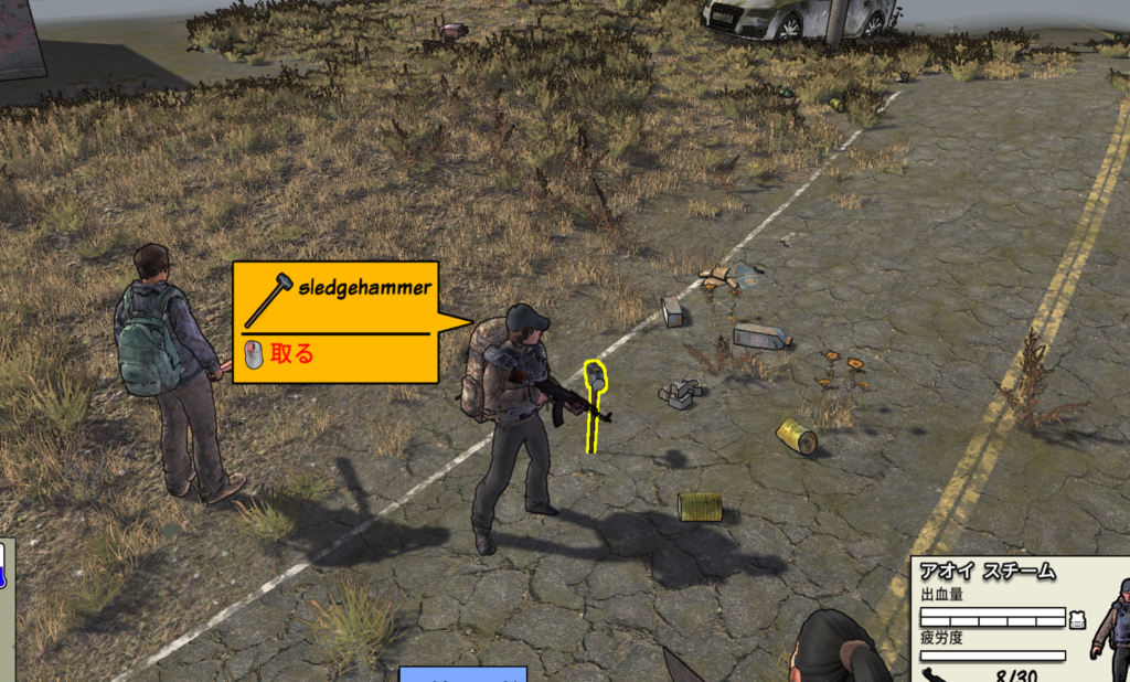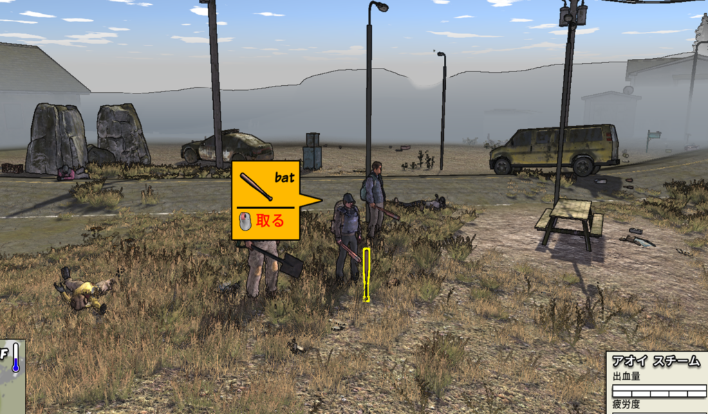 通常ではアイテムが落ちていることがなく、アイテムは基本建物やゾンビなどを倒して集めることがメインになりますが、道端で武器などを拾うことができるため、ゲーム開始直では武器確保に役に立ちます。