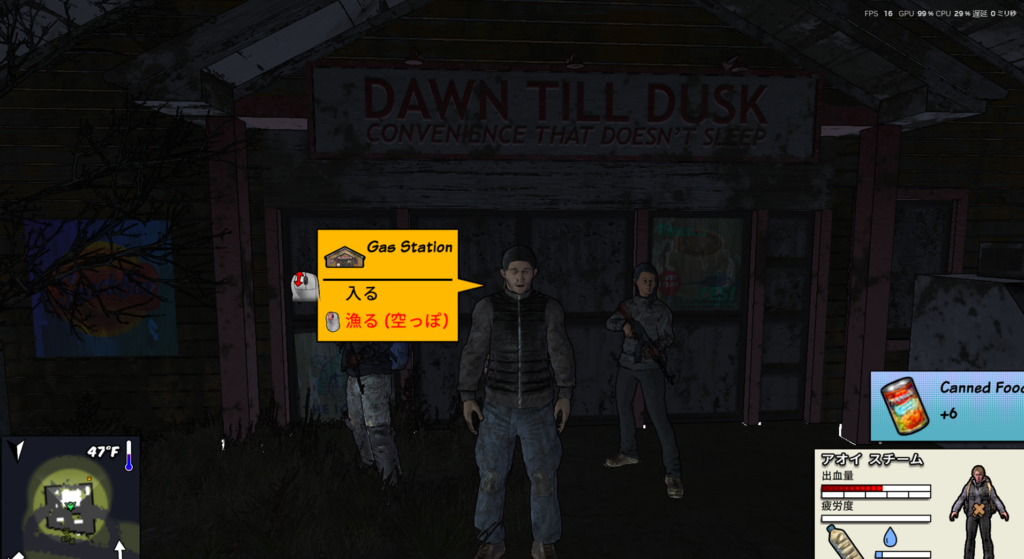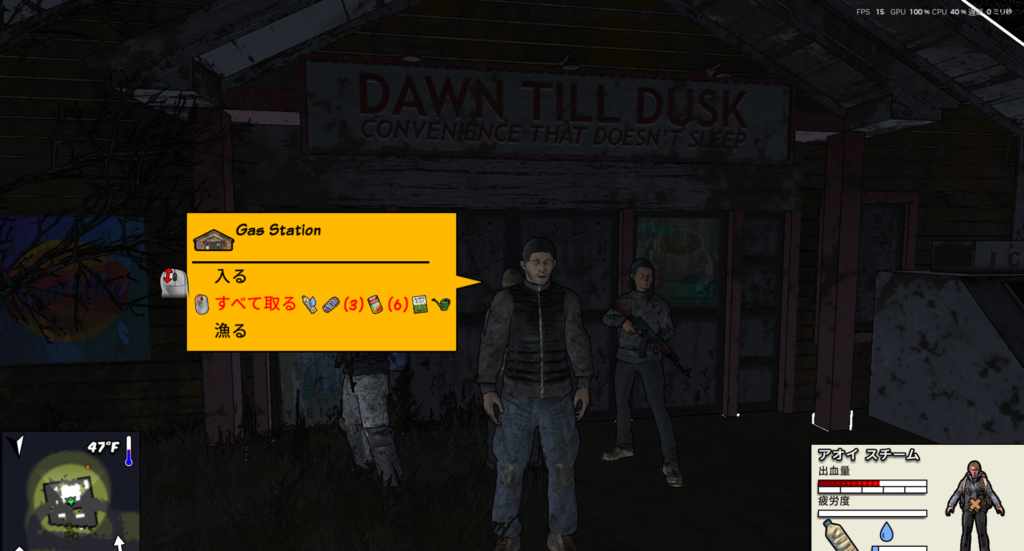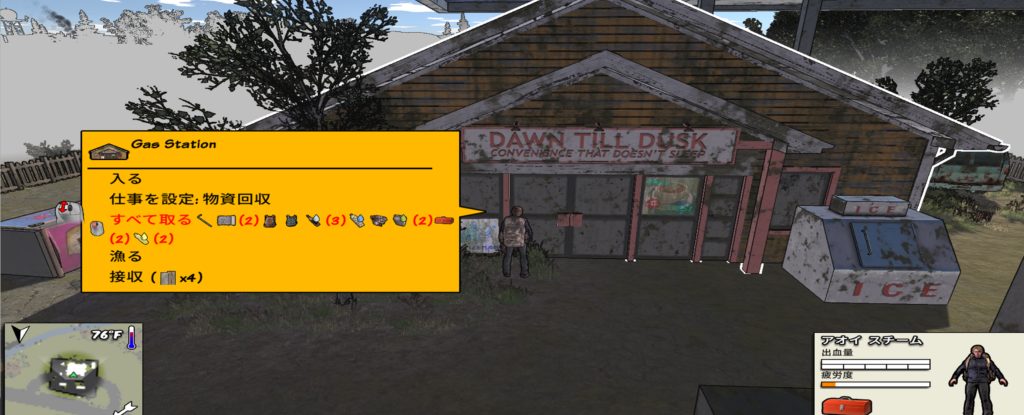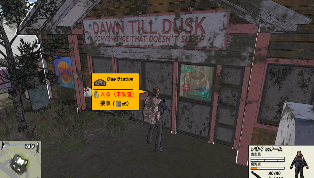 近くの建物でアイテムを回収してしまう頃には拠点もでき、ゾンビとも戦えるようになると思います。