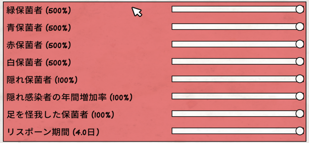一部変化がない項目もありましたが、色の保菌者(ゾンビ)の数は変更できるみたいです。